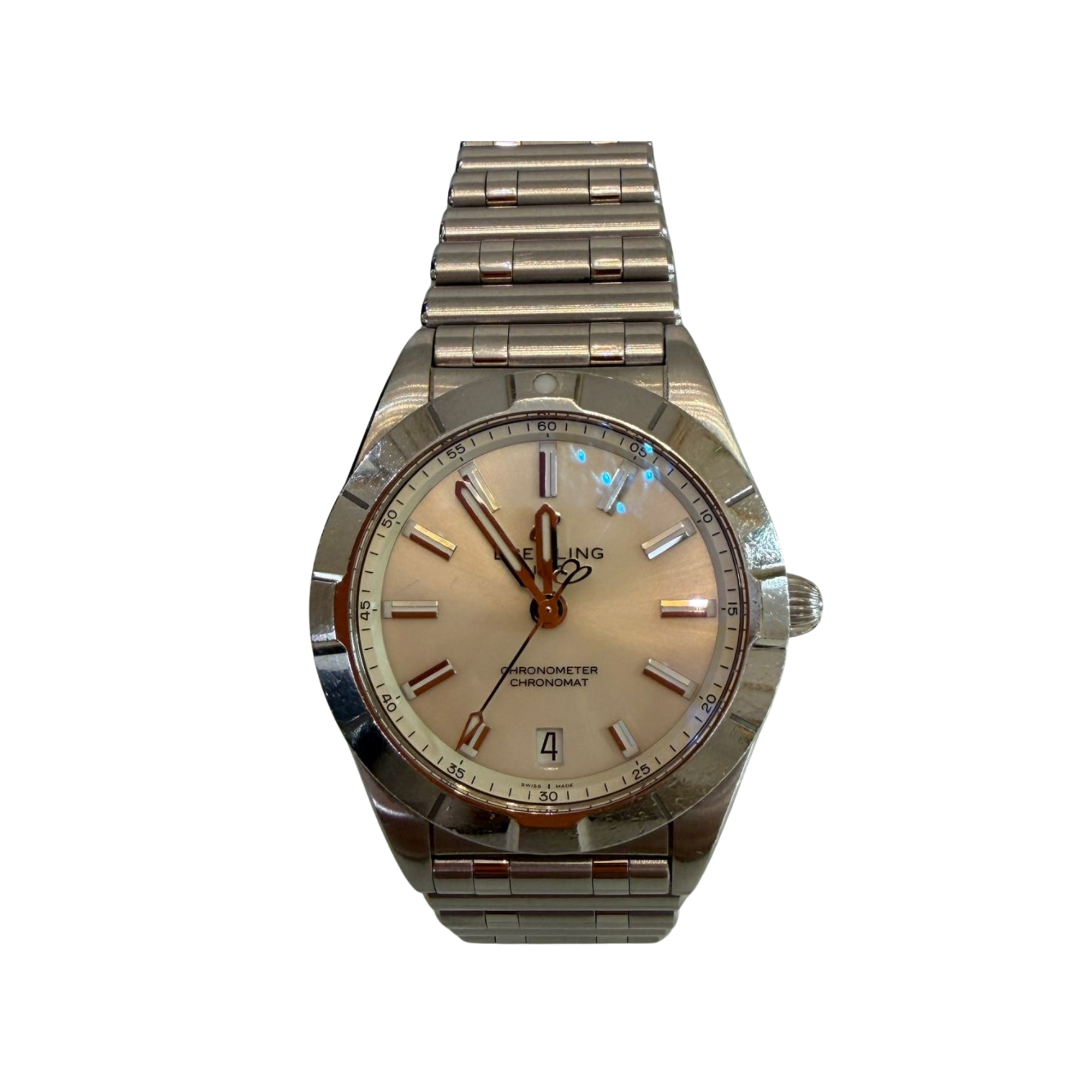 Montre Breitling Chronomat en acier avec cadran clair, index appliqués et date à 6 heures.